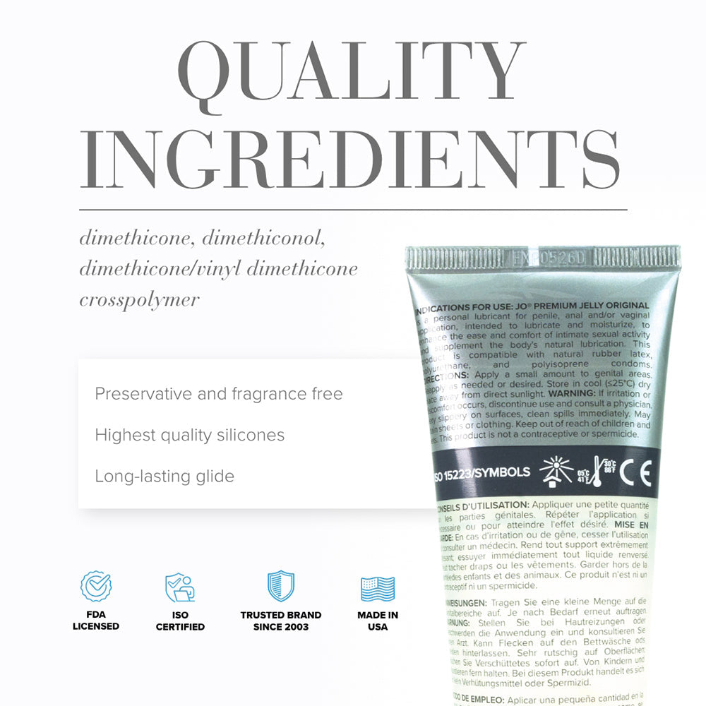 JO Premium Jelly Original is a luxurious, silicone-based formula that starts off thick and melts into a barely there long-lasting glide. JO Premium Jelly Original has that "just right" consistency and cling, so it's perfect for extended sessions when you want to feel every movement. Its carefully balanced formula even dries to a sumptuous soft-touch finish that leaves your skin feeling soft and moisturized. This silicone-based formula means you can enjoy "me time" even longer.Buttery FeelPreservative & Fragrance FreeHighest Quality SiliconesLong-Lasting GlideWater ResistantCompatible with Most Non-Silicone ToysCompatible with Most CondomsMade in the USAFDA LicensedISO Certified100% Pleasure GuaranteeIngredients: Dimethicone, Cyclopentasiloxane, Cyclotetrasiloxane, Dimethicone/Vinyl Dimethicone Crosspolymer, Dimethiconol